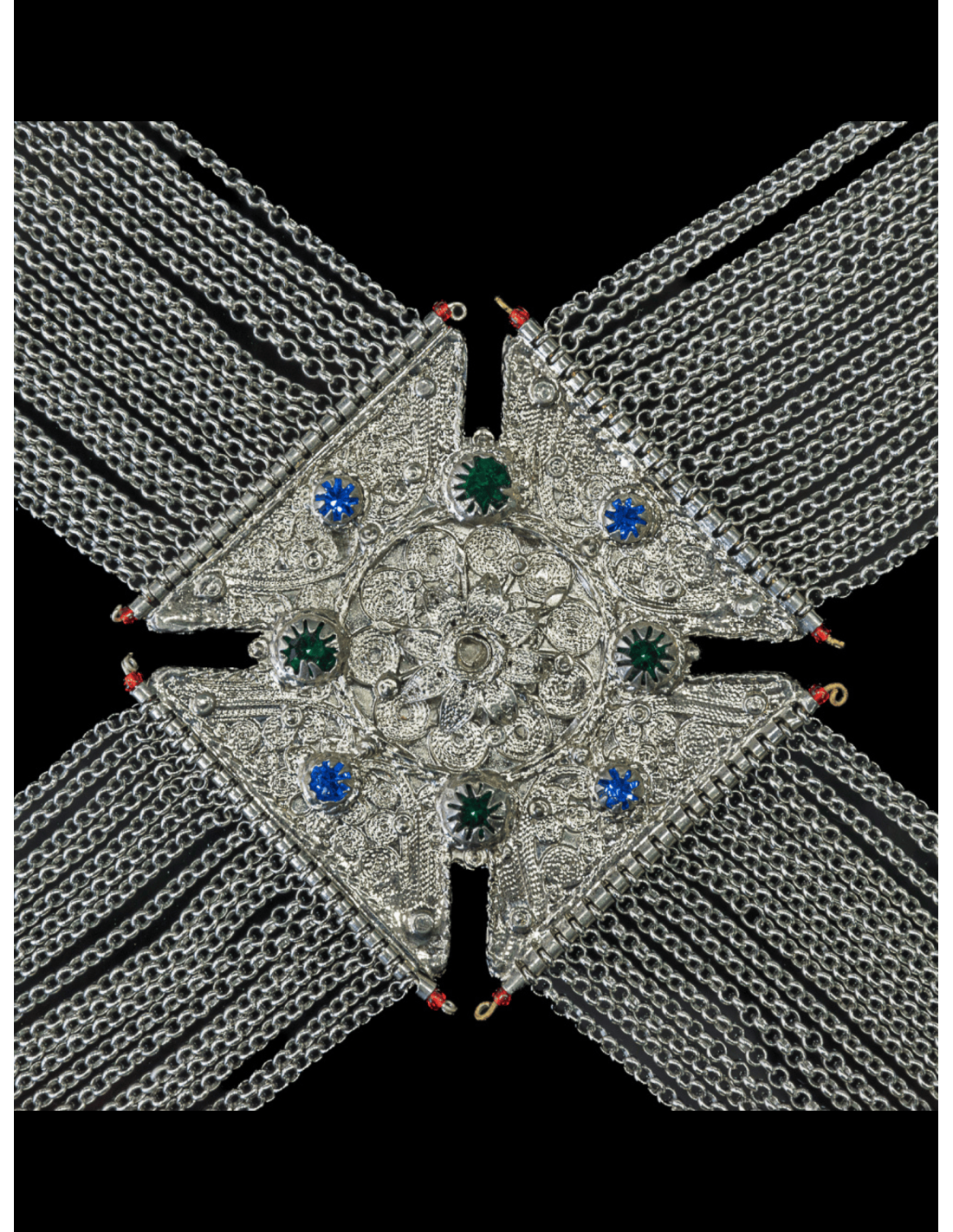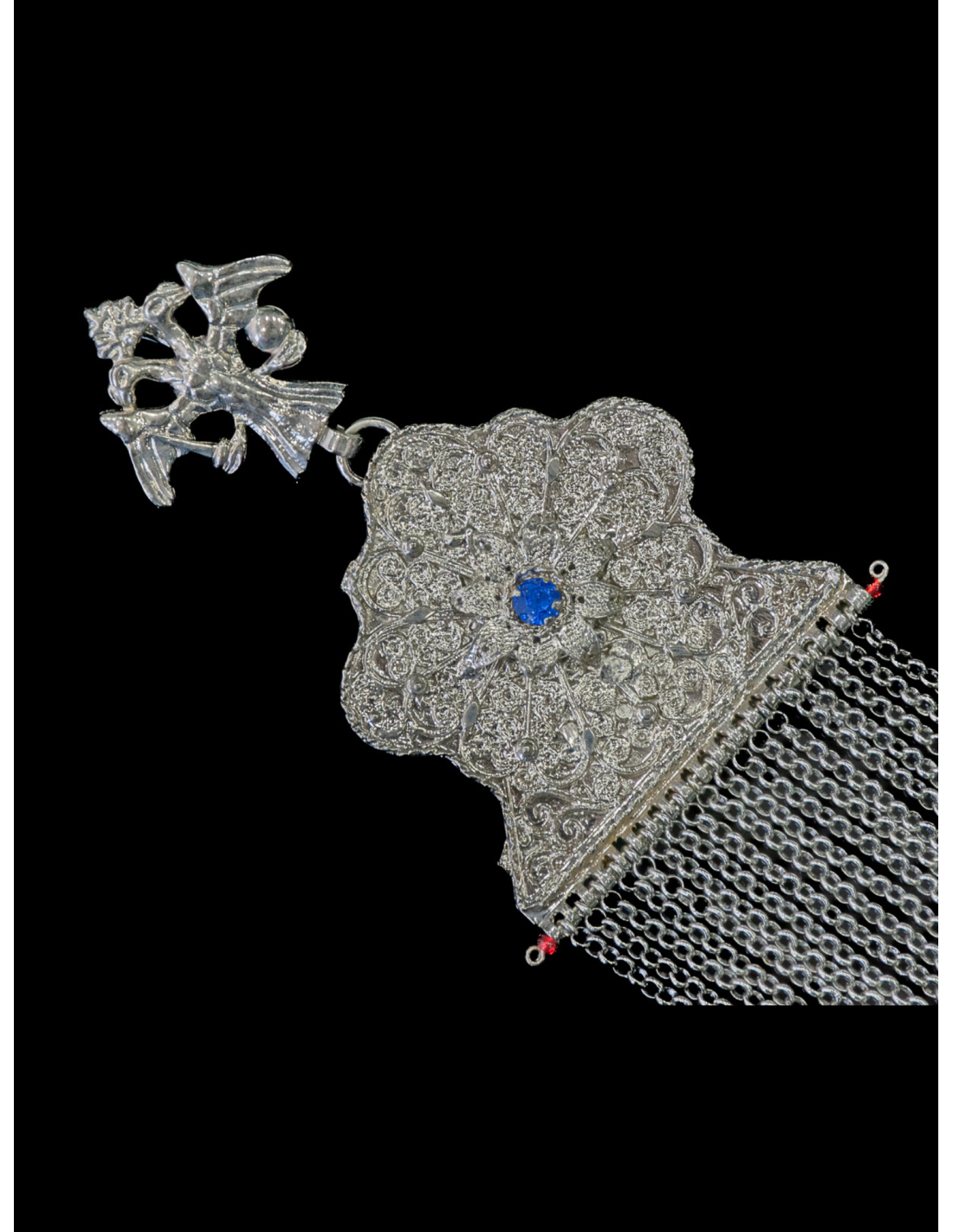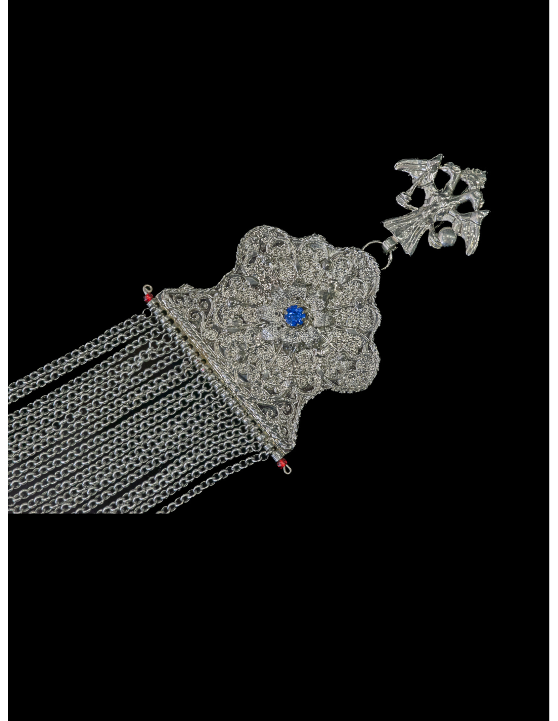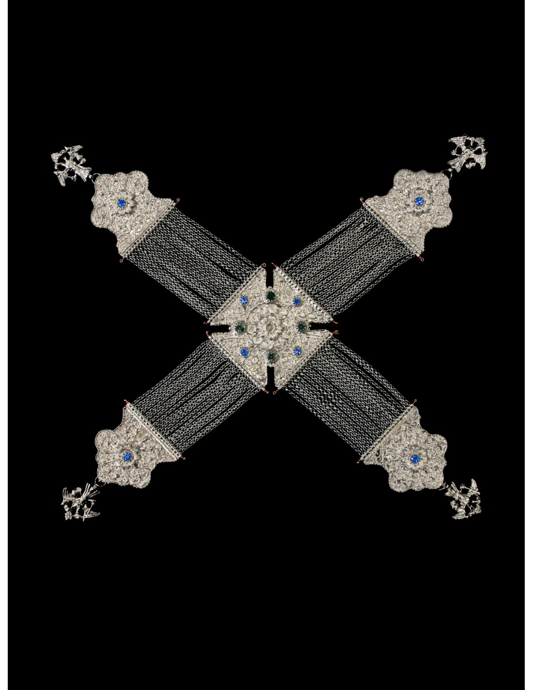 Σταυρωτό κιουστέκι κατασκευασμένο από μπρούτζο με επικάλυψη νίκελ, που συνδυάζει την παραδοσιακή βυζαντινή αισθητική με την ανθεκτικότητα. Ο σταυρός (8 × 8 εκ.) και οι ακροδέκτες (6.5 × 10 εκ.) συνδέονται με 18 αλυσίδες ανά ακροδέκτη, δημιουργώντας ένα εντυπωσιακό και επιβλητικό σύνολο. Η μπρούτζινη βυζαντινή καδένα σε λευκό χρώμα (μήκους 6 μ.) προσδίδει κομψότητα και αντοχή, ενώ το συνολικό βάρος των 420 γρ. τονίζει τη στιβαρότητα της κατασκευής. Ένα διακοσμητικό κόσμημα ιδανικό για συλλογές, παραδοσιακές εμφανίσεις ή πολιτιστικές εκδηλώσεις.
